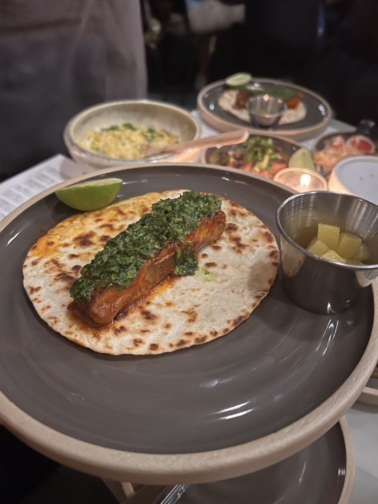 - Rabo, chef Ruben’s version of a birria taco with braised oxtail, topped with a Madrid style salsa brava made with paprika de la vera, shishito peppers, onions and cilantro