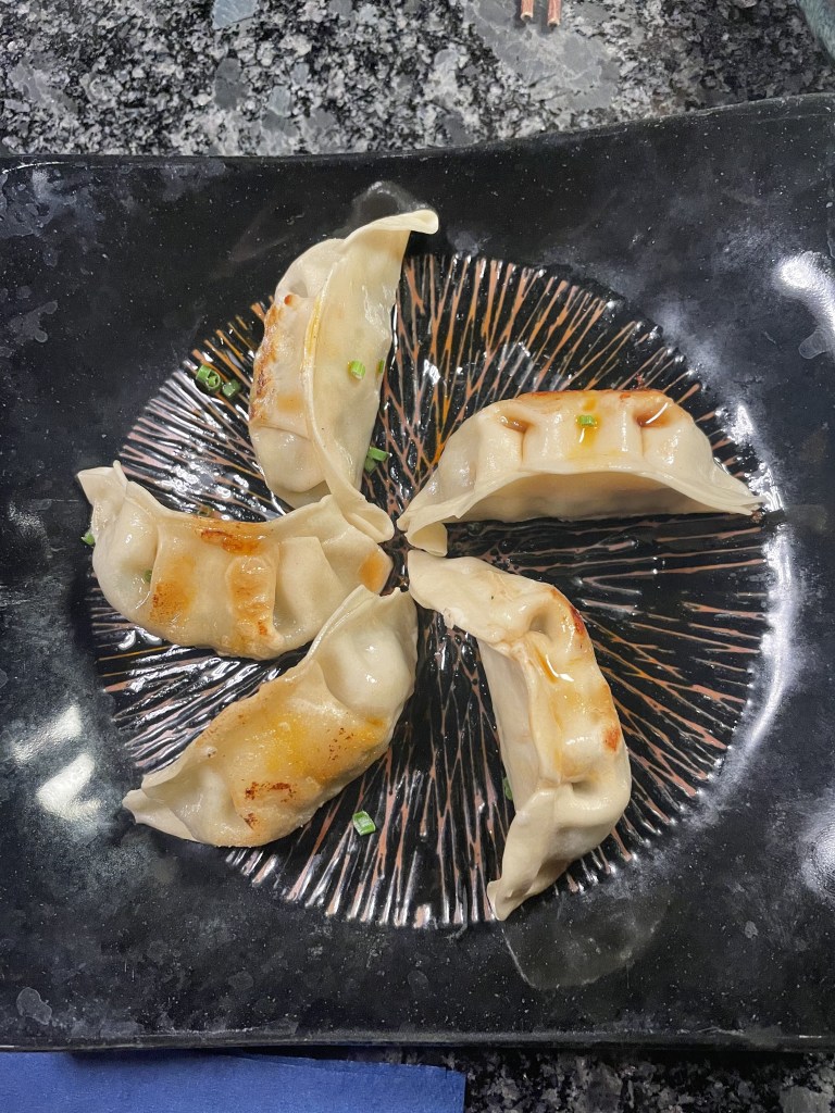 - Pork Gyoza, pan fried with housemade ponzu sauce and a fiery chili oil