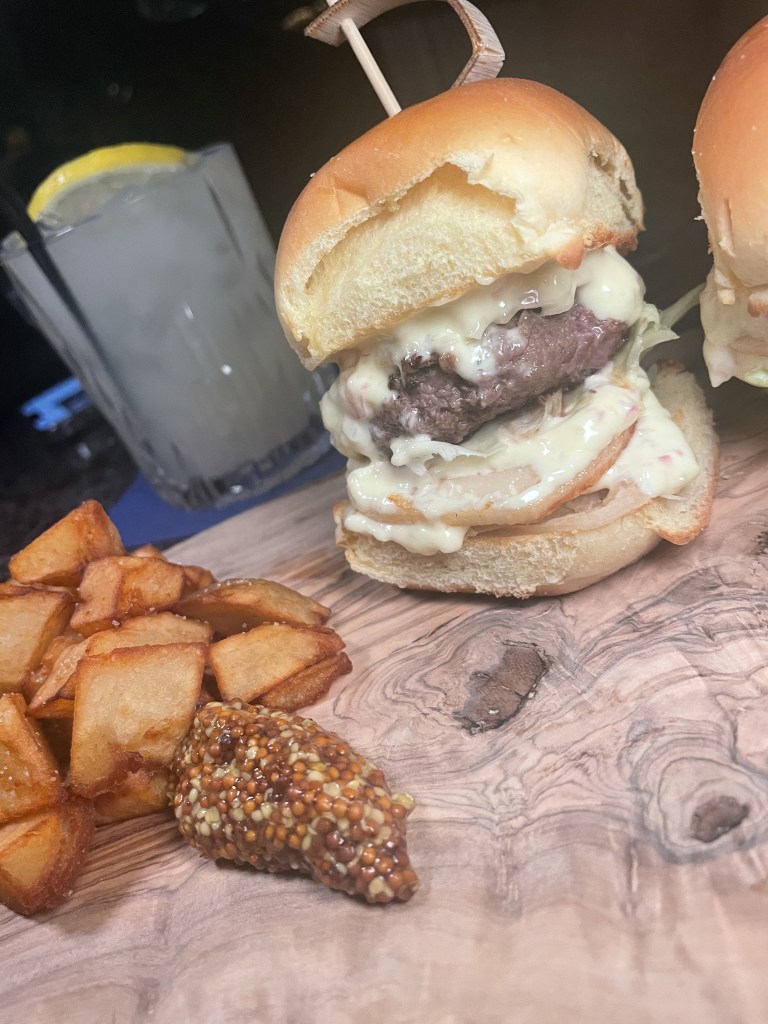 - 401 Wagyu Sliders with housemade wagyu patties, zesty garlic mayo, lotus chip and served with fried potatoes.