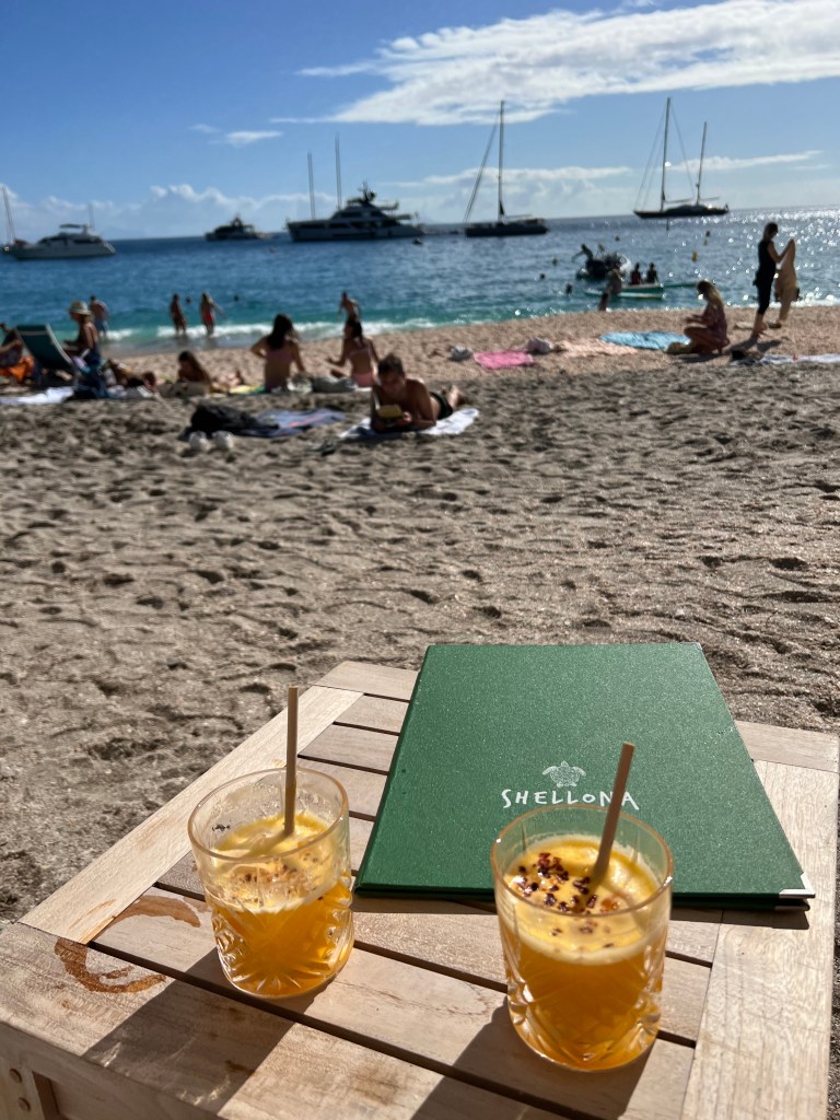 For lunch, perched over the sheltered cove with one of the best swimmable beaches on the island, the Greek-influenced Shellona is a favorite for long lunches that linger through sunset. The vibey restaurant shows off the best views. I had a delicious Mediterranean lunch from my sun chair, watching the waves crash and beautiful yachts.