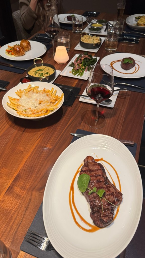 And the wine menu — wow. Easily one of the best I’ve seen in Kansas City. They offer a beautiful selection from California to France, and the team knows exactly what to recommend. We went with a bold Cabernet Sauvignon that paired like a dream with our steaks.