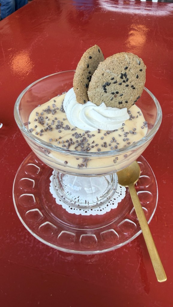 For dessert, I had to try the banana pudim with a sesame cookie. It was incredible. Light, sweet, and perfectly balanced, the dessert felt playful yet refined. Each bite made me smile and reminded me how much I love discovering small details that make a dish very special.